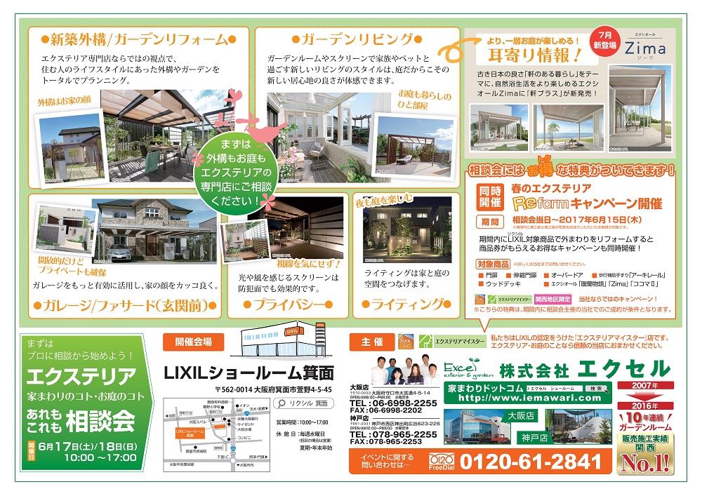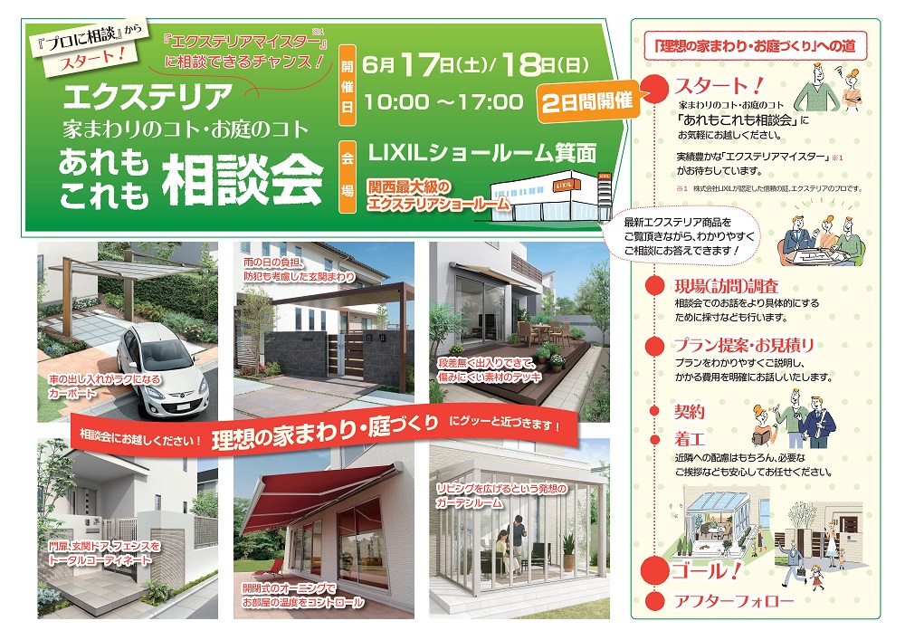 新着情報 6月17日、18日エクステリア相談会開催@LIXILショールーム箕面 6月17日、18日エクステリア相談会開催@LIXILショールーム箕面 6月17日(土)、18日(日) 10:00~17:00LIXILショールーム箕面で「あれもこれも相談会」を開催いたします。 最新エクステリア商品が揃っているLIXILさんのショールームで商品をご覧いただきながら、わかりやすくお悩み・ご相談にお答えできます。ぜひ一度ご来館下さい!ご予約もお待ちしております!※ご相談の際、お家の図面や外観写真などお持ちいただくとお話がスムーズに進みます。
