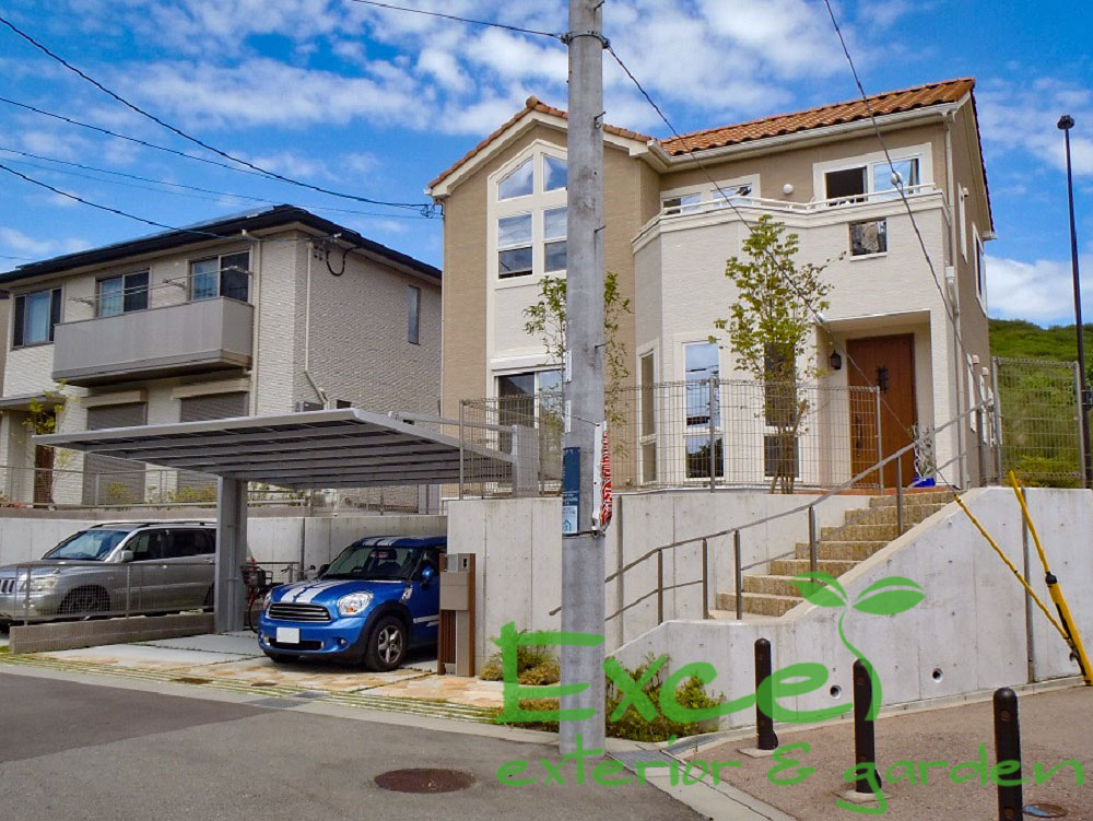 施工事例 LIXIL アーキフランワイド|車出し入れスムーズ|箕面市 アーキフランワイド|車出し入れスムーズ|箕面市 アーキフラン ワイド58-50型 ロング柱ナチュラルシルバー屋根材:熱線吸収ポリカ(クリアブルーS) 前方に柱が無いオープンな設計で、乗り降りもスムーズ。シンプルで直線的なスタイルなので、お家にもぴったり。ナチュラルシルバー色も手すりやフェンスにあっています。 フラットな屋根が擁壁のラインとなじんでスッキリ見せています。