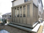ガーデンルームとお家が一体化したデザインをご希望されました。そこで、暖蘭物語の屋根を延長し、幕板を勝手口ドア側の壁にくっつけました。