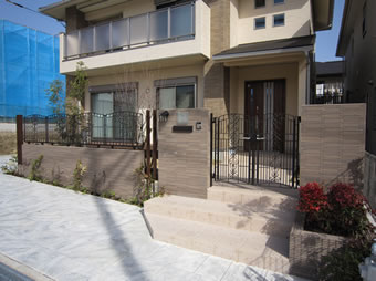 施工事例 新築外構 新築外構|箕面市 新築外構|箕面市 新築外構工事|大阪府箕面市アプローチ前のスペースをゆったりととったセミクローズ外構。 スタンプコンクリートの明るい色と、大きな石畳のような仕上げが門柱のタイルを引き立たせています。 2つの掃き出し窓の前には縁側を設置しました。 同じタグをつけた事例 新築外構|お家と同じタイルでこだわりのファサード|スマート宅配ポスト|枚方市 クローズ新築外構|小端積み塀をリアルに再現したブロックの門塀|カーポート|LIXIL 新築外構|同一デザインで美しいファサード|カーポート|LIXIL|八尾市